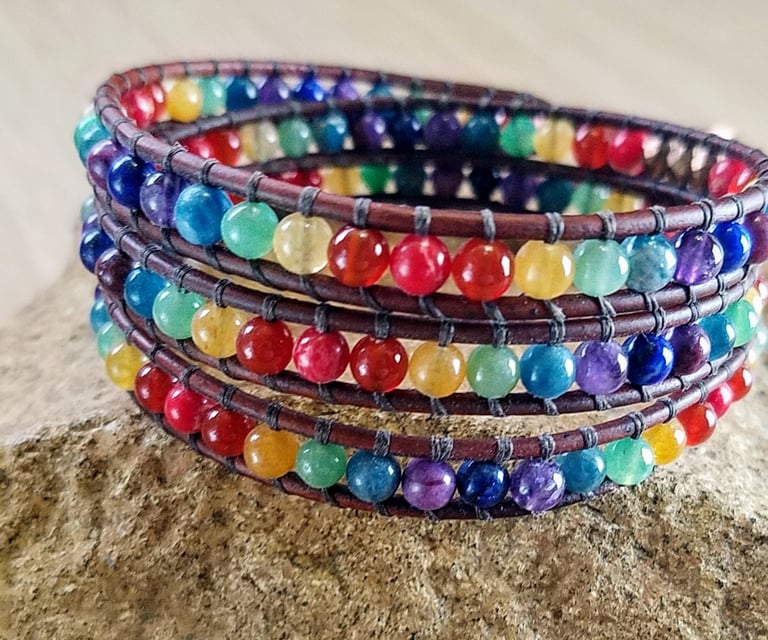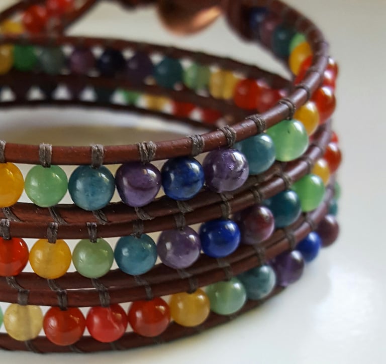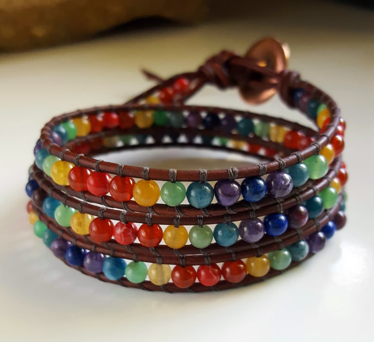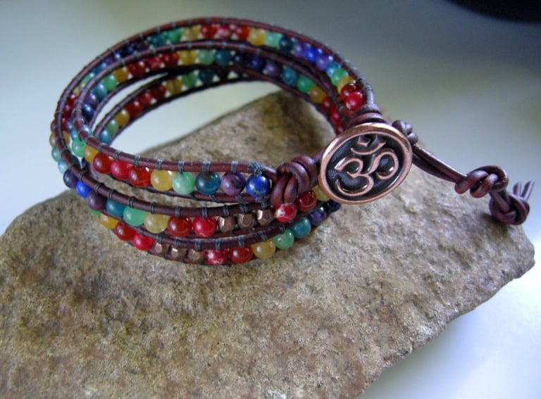 Heal and align your seven Chakras with our Meditative Wrap Bracelet. Every color represents one of the seven Chakra centers in the body energy is said to flow through. Wrap bracelet is hand crafted with all natural gemstones and high quality leather. Bracelet measures about 21" long and will wrap comfortably three times around most wrists. Adjustable closure is finished with an "Ohm" symbol button clasp. For custom requests feel free to contact us here through our website.