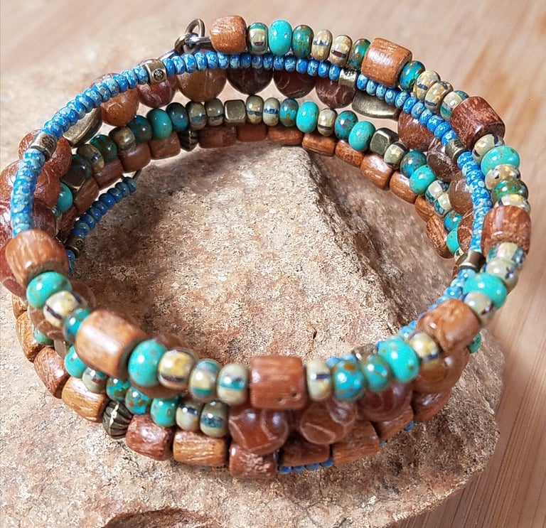 Bracelet is crafted with carved Jade, wood, and Picassco seed beads. Perfect for anytime of year, this fashionable bracelet is made with stainless steel memory wire. Which means it always retains its shape, and there's no need for a clasp. Bracelet naturally adjusts to the size of your own wrist. Shipping is always free within the United States. Worldwide shipping is available.