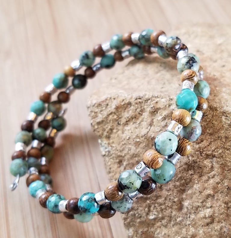 Bracelet is crafted with African Turquoise semi precious gemstones, wood beads, and silver tone pewter beads. Perfect for anytime of year, this fashionable bracelet is made with stainless steel memory wire. Which means it always retains its shape, and there's no need for a clasp. Bracelet naturally adjusts to the size of your own wrist. Shipping is always free within the United States. Worldwide shipping is available.
