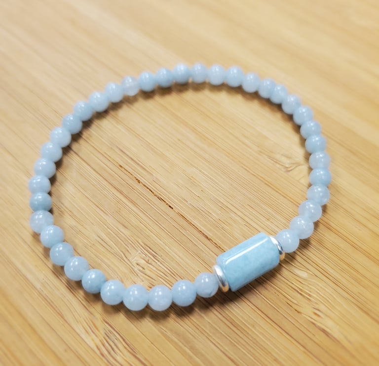 Bracelet is crafted with 4 mm Aquamarine gemstones finished with a beautiful focal bead and pewter spacers. Makes a wonderful gift! Shipping is free within the US