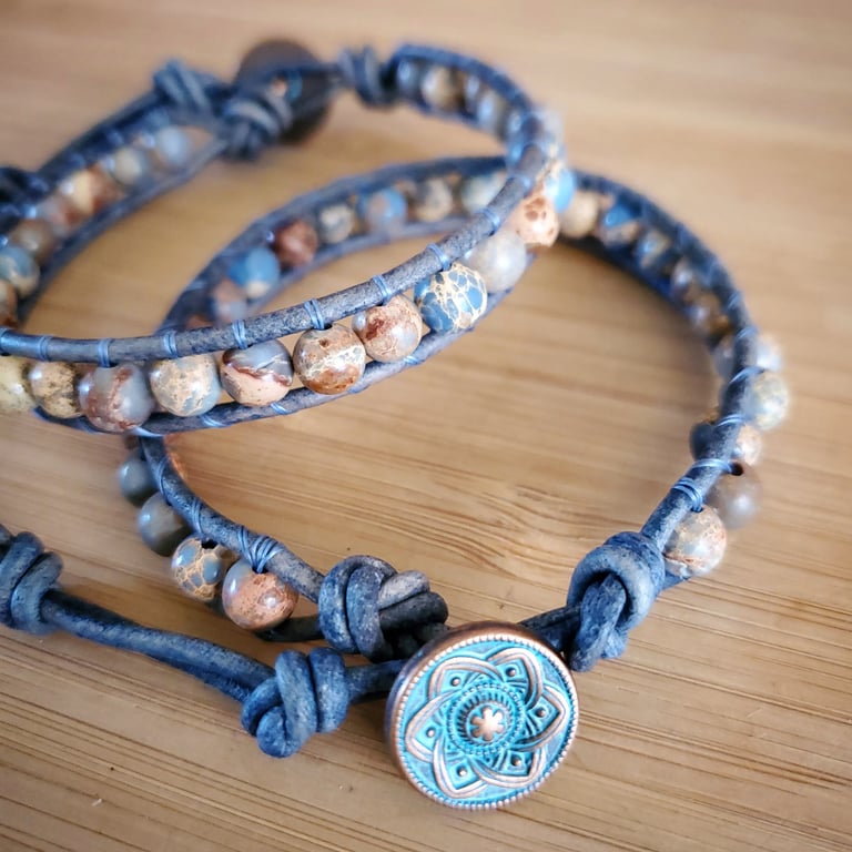 Leather bracelet is made with 6mm Light Blue Sea Sediment Jasper gemstones. Woven onto distressed blue leather, finished with a decorative pewter button clasp. Bracelet measures about 7 inches long with three adjustable closures. Shipping is always free within the US. Worldwide shipping is available.