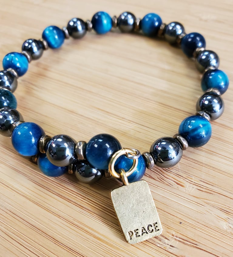 Bracelet is handcrafted with 8mmTiger's Eye gemstones and 8mm Hematite gemstones. Highlighted with a antiqued pewter charm. Strung on stainless steel memory wire, bracelet will naturally adjust to most wrists. Great for a man or a woman. Free Priorty Usps shipping within the US. Worldwide shipping is available.