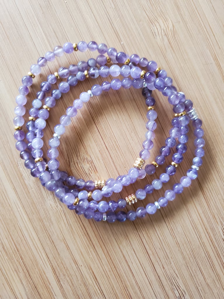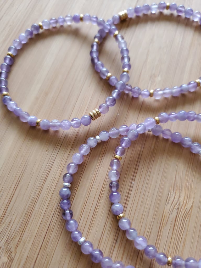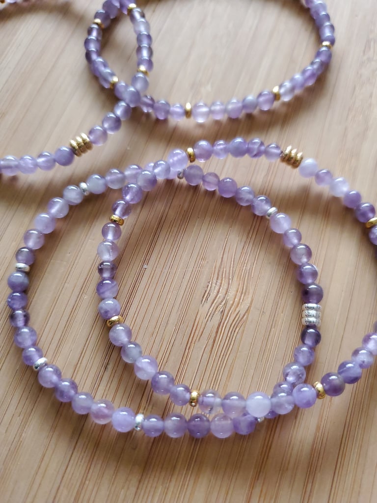 Natural Amethyst 4mm gemstones on Elastic stretch cord. Available with Gold finish.