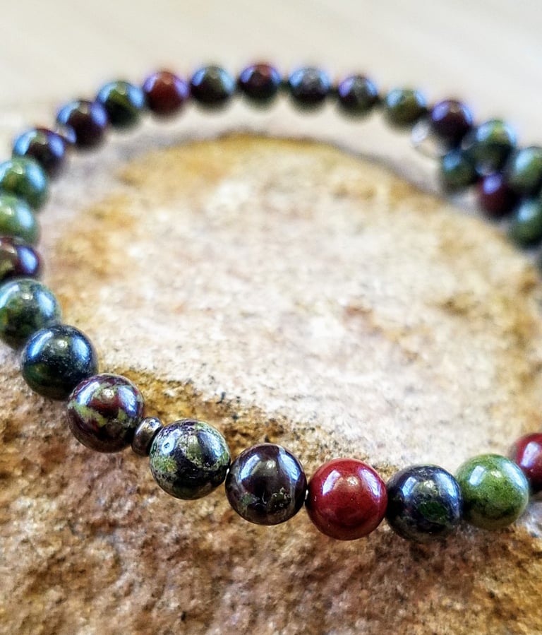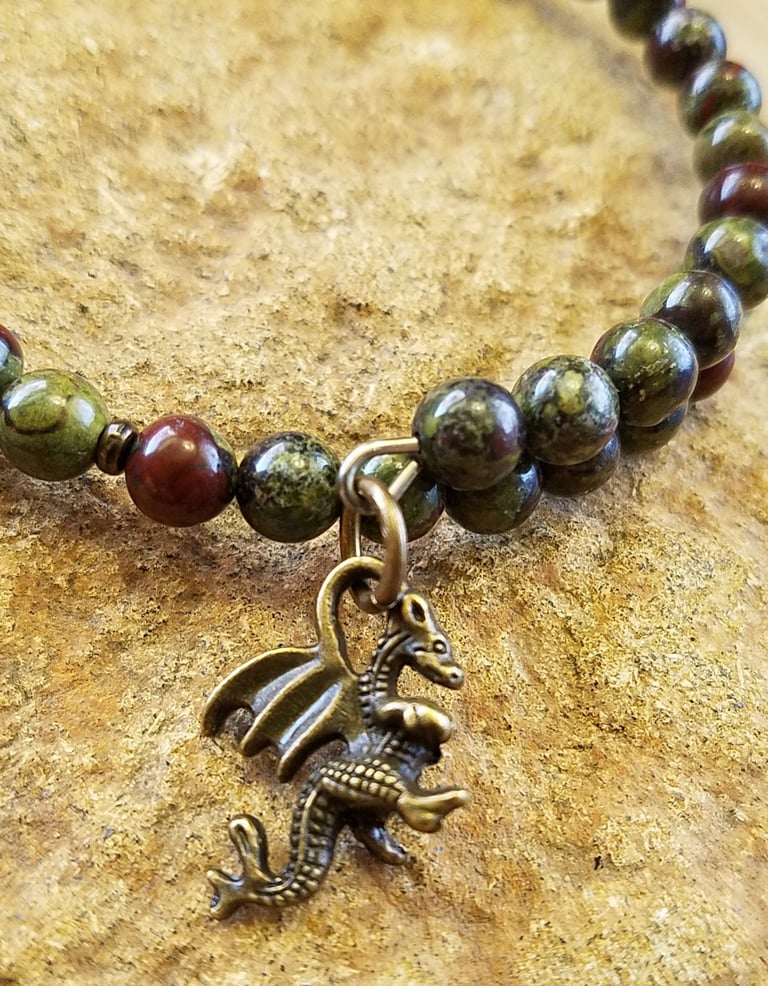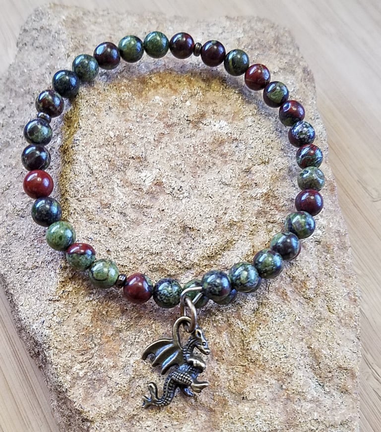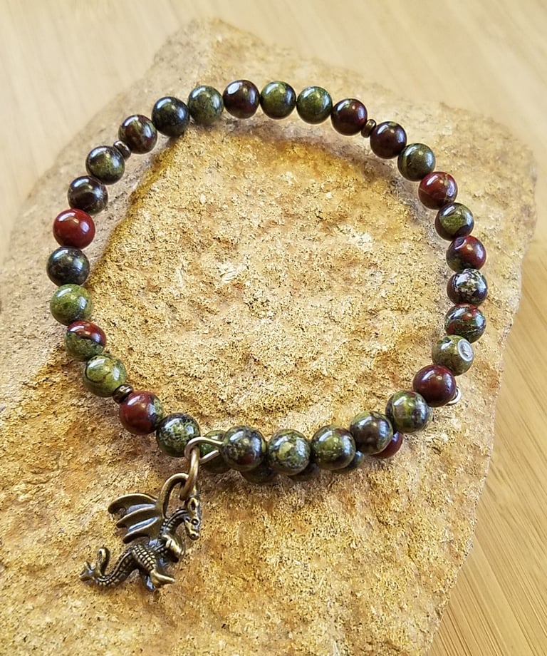 Bracelet is handcrafted with natural Dragon Blood Jasper gemstones and antique pewter Dragon charm. Perfect for a man or woman. Beads are strung on stainless steel memory wire which means you'll never need a clasp, and the bracelet will naturally adjust to the size of your wrist. Shipping is always free within the United States. Worldwide shipping is available.