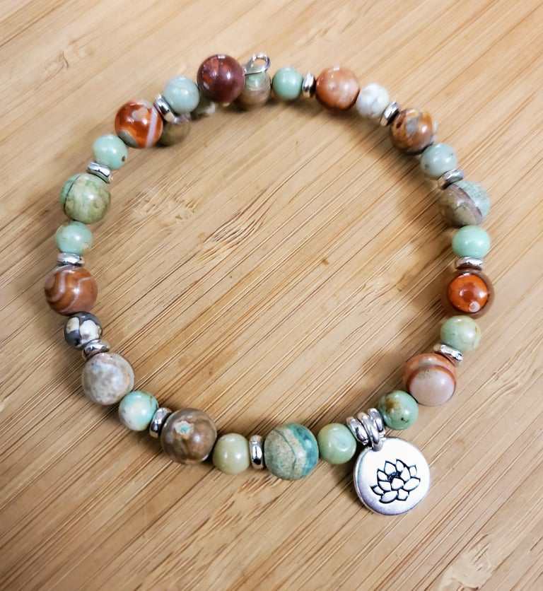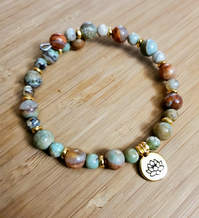 Inspired by the popular Mala bracelet style this bracelet features Dragon Skin Agate and Chrysoprase gemstones. Highlighted with non tarnish pewter beads and finished with a pewter lotus charm. Strung on stainless steel memory wire, bracelet will naturally adjust to the size of your wrist. Available in gold and silver finish. Shipping is free within the US. Worldwide shipping is available.