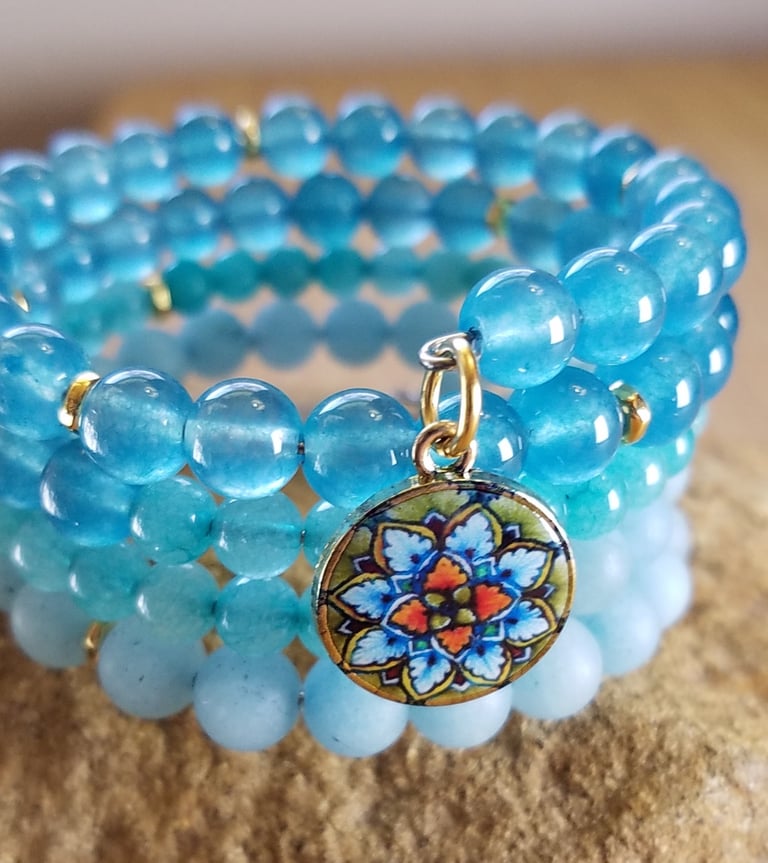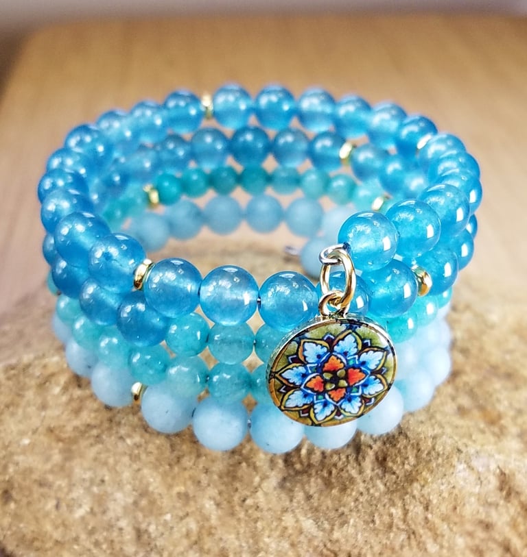 Beautiful semi precious Agate and Amazonite beads are featured in this newest bracelet. Finished off with a gold mandala charm. Beads are strung on stainless steel memory wire, you'll never need a clasp. Bracelet will naturally adjust to the size of your own wrist. Shipping is free within the United States. Worldwide shipping is available.