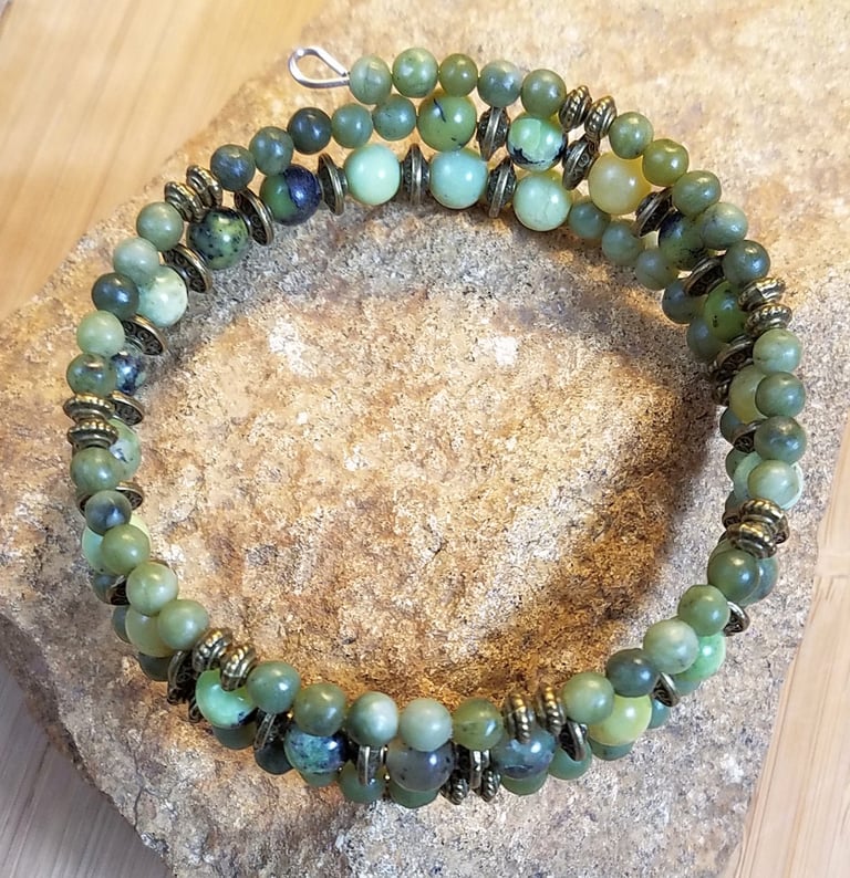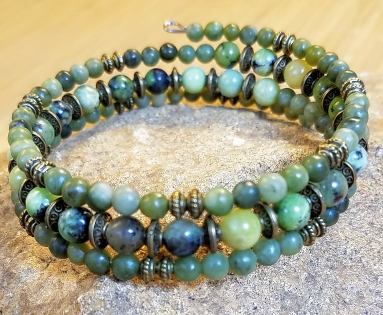 Green Agate Wrap Bracelet is handcrafted on stainless steel memory wire which means no need for a clasp. Bracelet naturally adjusts to the size of your wrist. Accented with non-tarnish antiqued pewter spacers. Perfect for a man or a woman! Shipping is always free within the United States. Worldwide shipping is available. Feel free to contact for custom design requests.