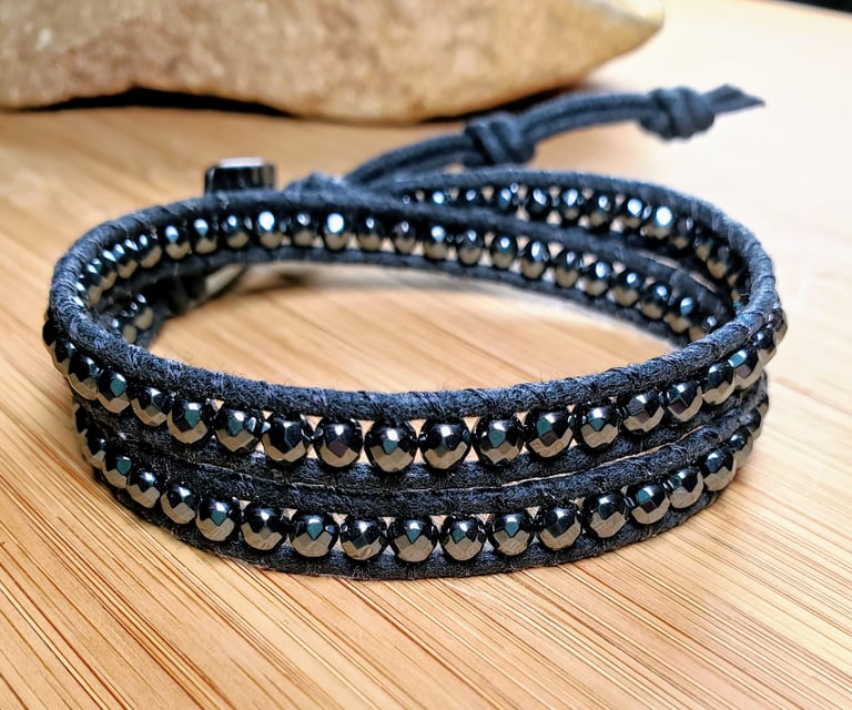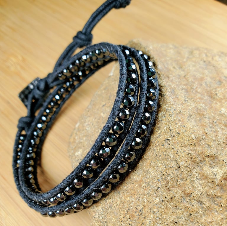 Bracelet is handcrafted with 4mm faceted Hematite gemstones. Strung on strudy waxed cotton cord, bracelet measures about 14 inches long with three adjustable closures. Will wrap twice around most wrists. Finished with a pewter button clasp. Perfect for a man or a woman. Free Priority Usps shipping within the US.