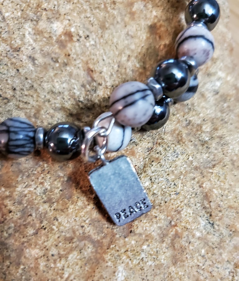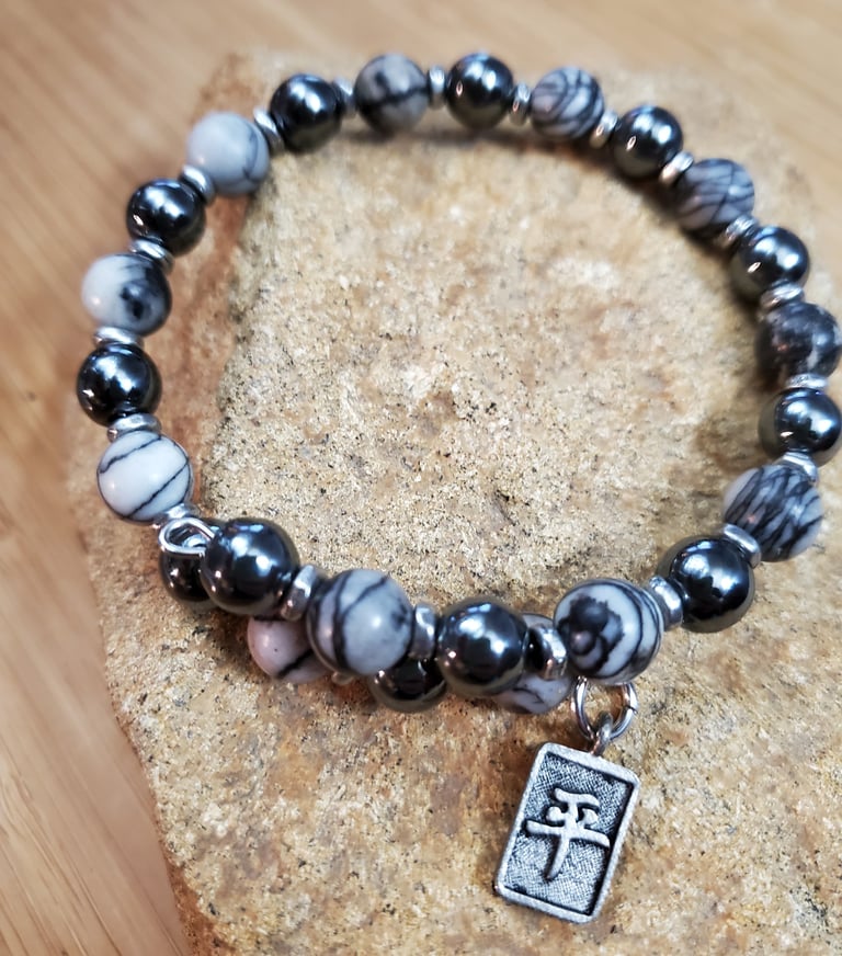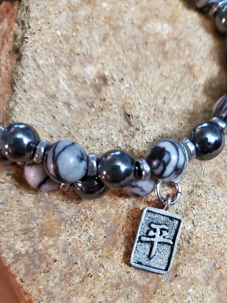 Bracelet is handcrafted with 8mm Hematite and Black Veined Jasper. Highlighted with non tarnish pewter beads and finished with an antiqued pewter charm. Strung on stainless steel memory wire, bracelet will naturally adjust to most wrists. Hematite is said to be a protective and grounding gemstone. Jasper is known to calm and align your senses. Perfect for a man or a woman. Free Priority Usps shipping within the US. Worldwide shipping is available.