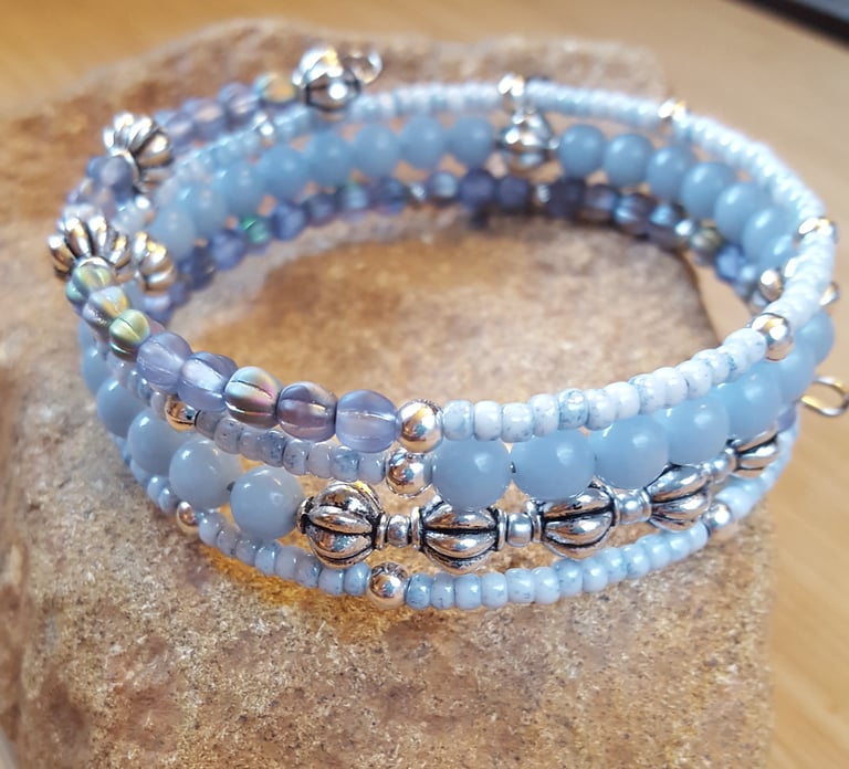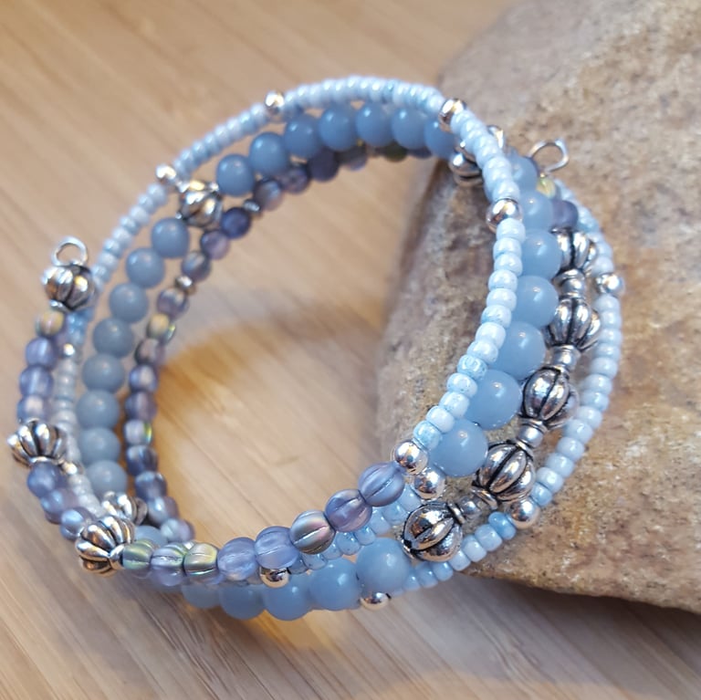 Light Blue wrap bracelet is easy to wear and makes a perfect gift! Gemstone beads and silvertone spacers are strung on heavy duty memory wire which retains its shape and adjust to your wrist. There's no need to measure and no clasp is necessary. Shipping is always free in the US