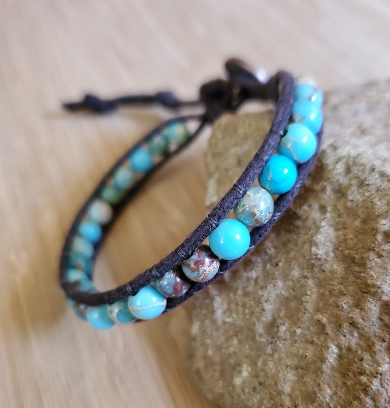Bracelet is made with 6mm Aqua Sea Sediment Jasper gemstones. Woven onto strurdy brown waxed cotton cord finished with a decorative pewter button clasp. Bracelet measures about 7 inches long with three adjustable closures. Shipping is always free within the US. Worldwide shipping is available.