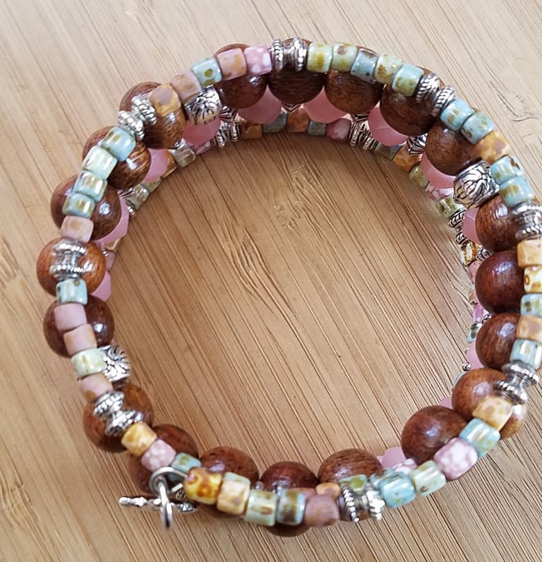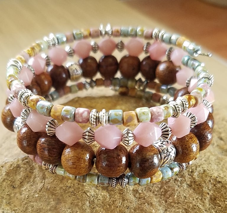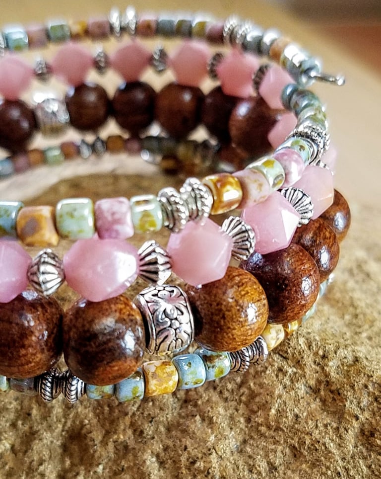 Bracelet features Pink Opal gemstones, Natural wood beads, and Picasso seed beads. Highlighted with non tarnishing pewter spacers and sun charm. Beads are strung on stainless steel memory wire. Bracelet will retain its shape and naturally adjust to the size of your wrist. Shipping is free within the US. Worldwide shipping is available.