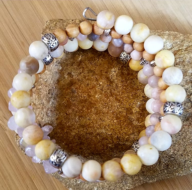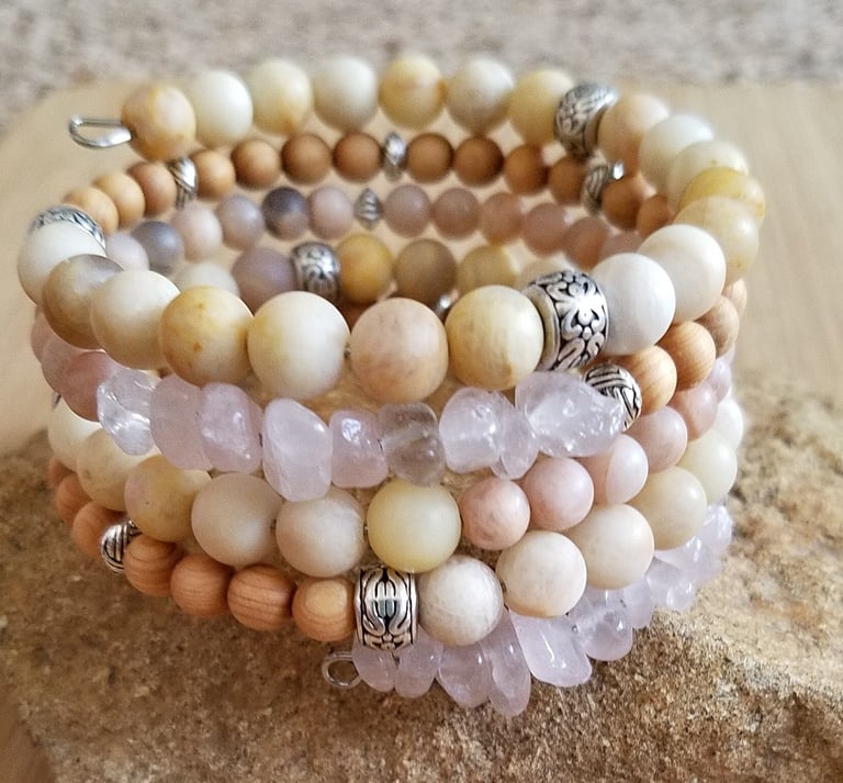 Semi precious Sunstone, Moonstone, and natural wood beads are featured in this newest Wrap Bracelet. Perfect for Spring or Summer, bracelet is fashioned on stainless steel memory wire. There is no need for a clasp and bracelet self adjusts to your wrist size naturally. Shipping is always free within the United States. Worldwide shipping is available.
