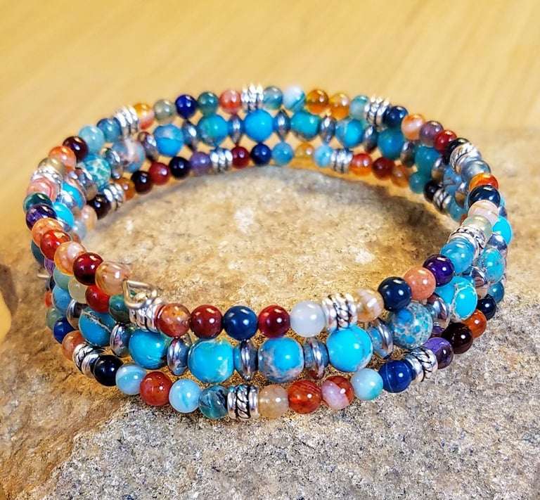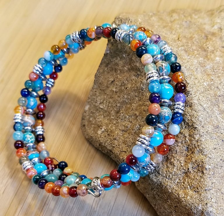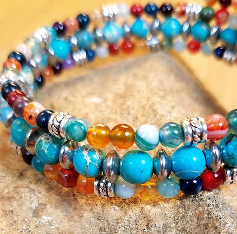 Give your life a little color! Rainbow Agate gemstones are featured along with non -tarnish pewter spacers and Agate gemstones. Strung on stainless steel memory wire, bracelet retains its shape and naturally adjusts to the size of your wrist. No clasp is needed. Shipping is always included within the United States. Worldwide shipping is available. Feel free to contact for custom design requests.