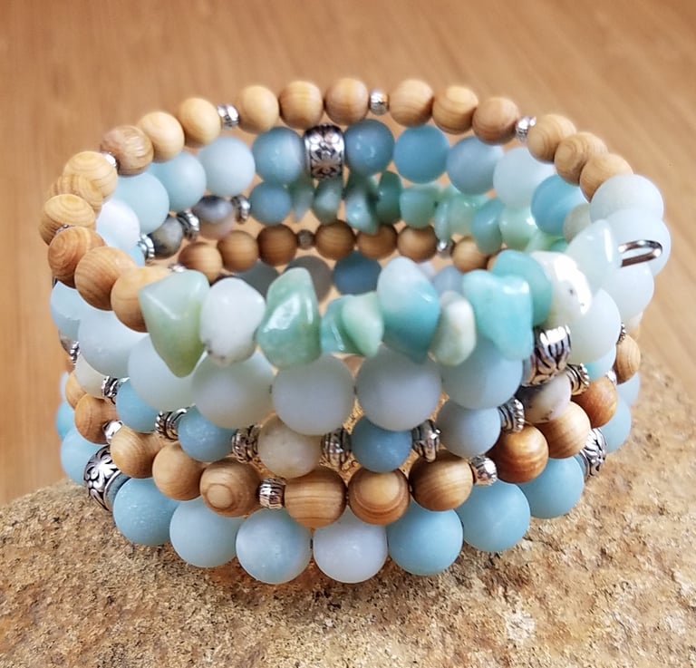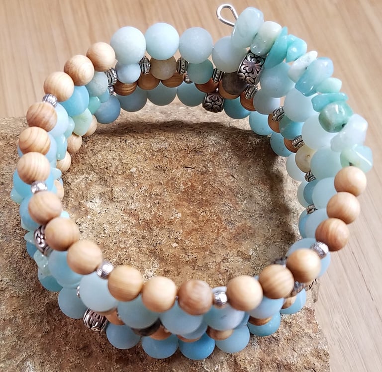 Semi precious Aqua Amazonite gemstones and natural wood beads are featured in this newest Wrap Bracelet. Perfect for Spring or Summer, bracelet is fashioned on stainless steel memory wire. There is no need for a clasp and bracelet self adjusts to your wrist size naturally. Shipping is always free within the United States. Worldwide shipping is available.