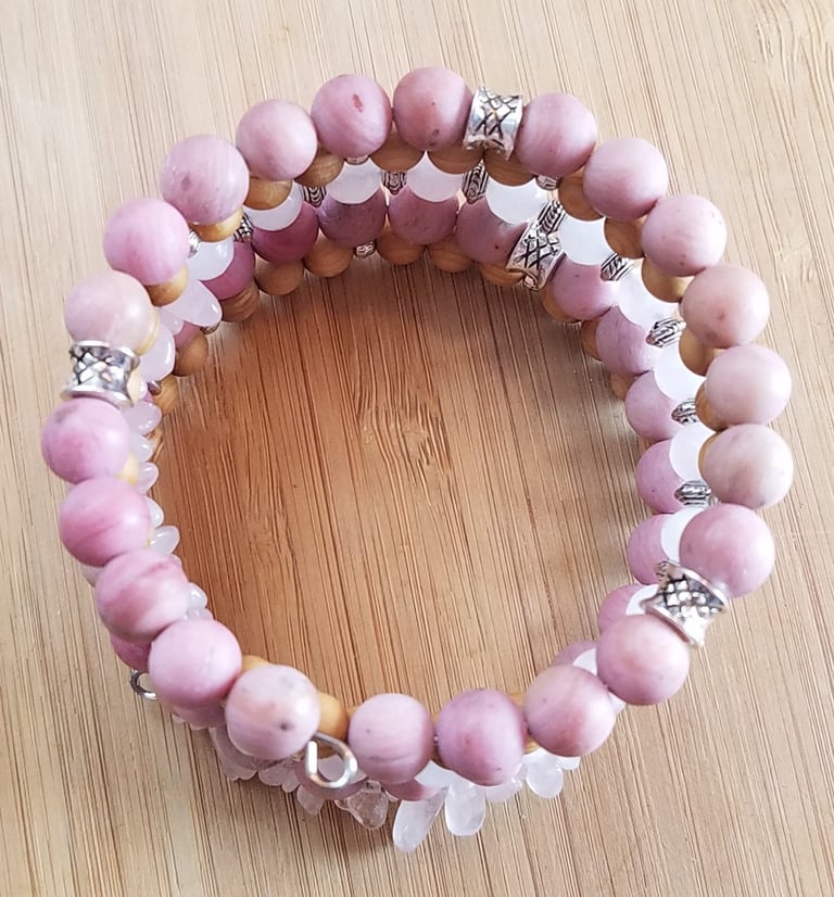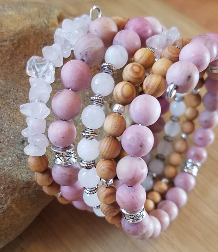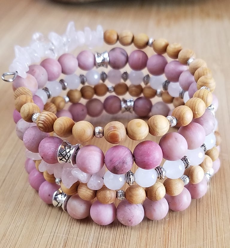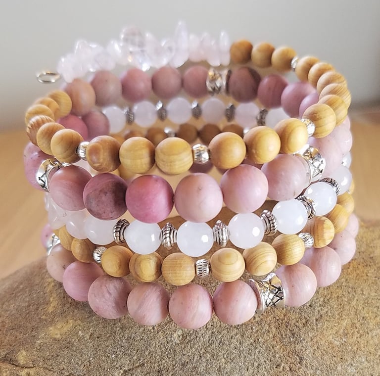Semi precious Rose Quartz, Rhodochrosite gemstones and natural wood beads are featured in this newest Wrap Bracelet. Perfect for Spring or Summer, bracelet is fashioned on stainless steel memory wire. There is no need for a clasp and bracelet self adjusts to your wrist size naturally. Shipping is always free within the United States. Worldwide shipping is available.