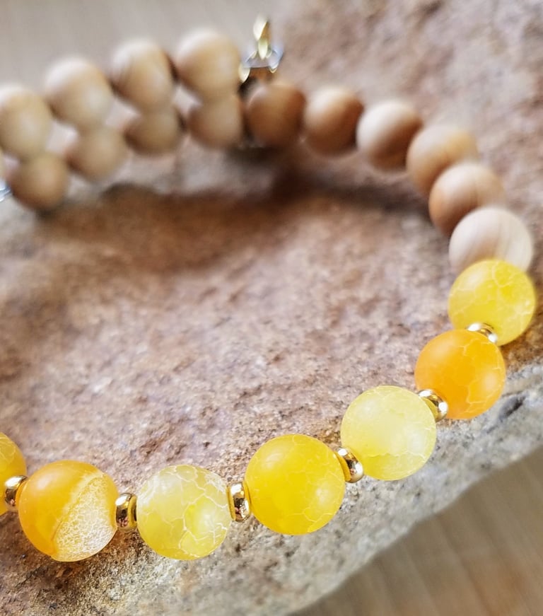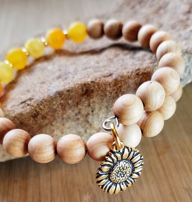 Bracelet is handcrafted with yellow agate and natural wood beads. Finished with a pewter sunflower charm. Lightweight and stylish, beads are strung on stainless steel memory wire which means you'll never need a clasp. Bracelet will retain its shape and naturally adjust to the size of your wrist. Shipping is always free within the United States. Worldwide shipping is available.