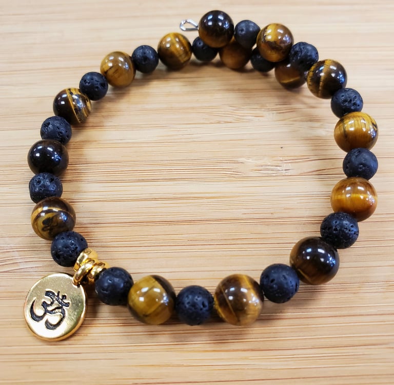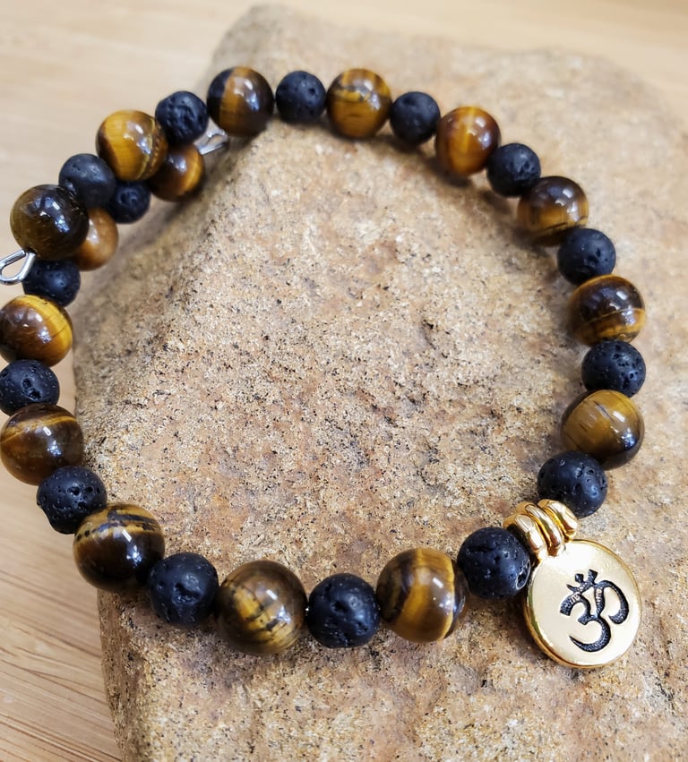 Tiger's Eye 8mm gemstones are the star in this unisex style bracelet. Highlighted with 6mm Lava Stone and a gold pewter Ohm charm, popular in meditation. Strung on stainless steel memory wire, bracelet will naturally adjust to the size of most wrists. Free Priorty Usps shipping within the US. Worldwide shipping is available.