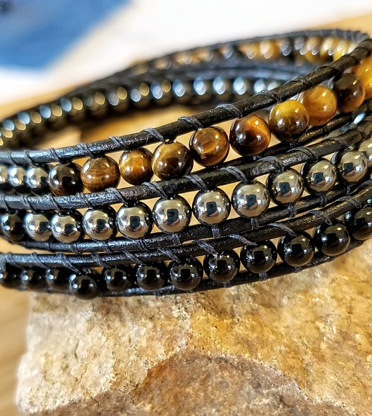Bracelet is handcrafted with 4mm Tigers Eye, Hematite, and Black Onyx gemstones handwoven onto sturdy Greek Leather cord. Bracelet has three adjustable closures and is finished with a pewter button clasp. When combined, these gemstones are said to have wonderful protection and grounding properties. Shipping is always free within the United States. Worldwide shipping is available.